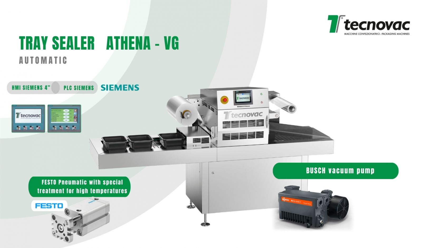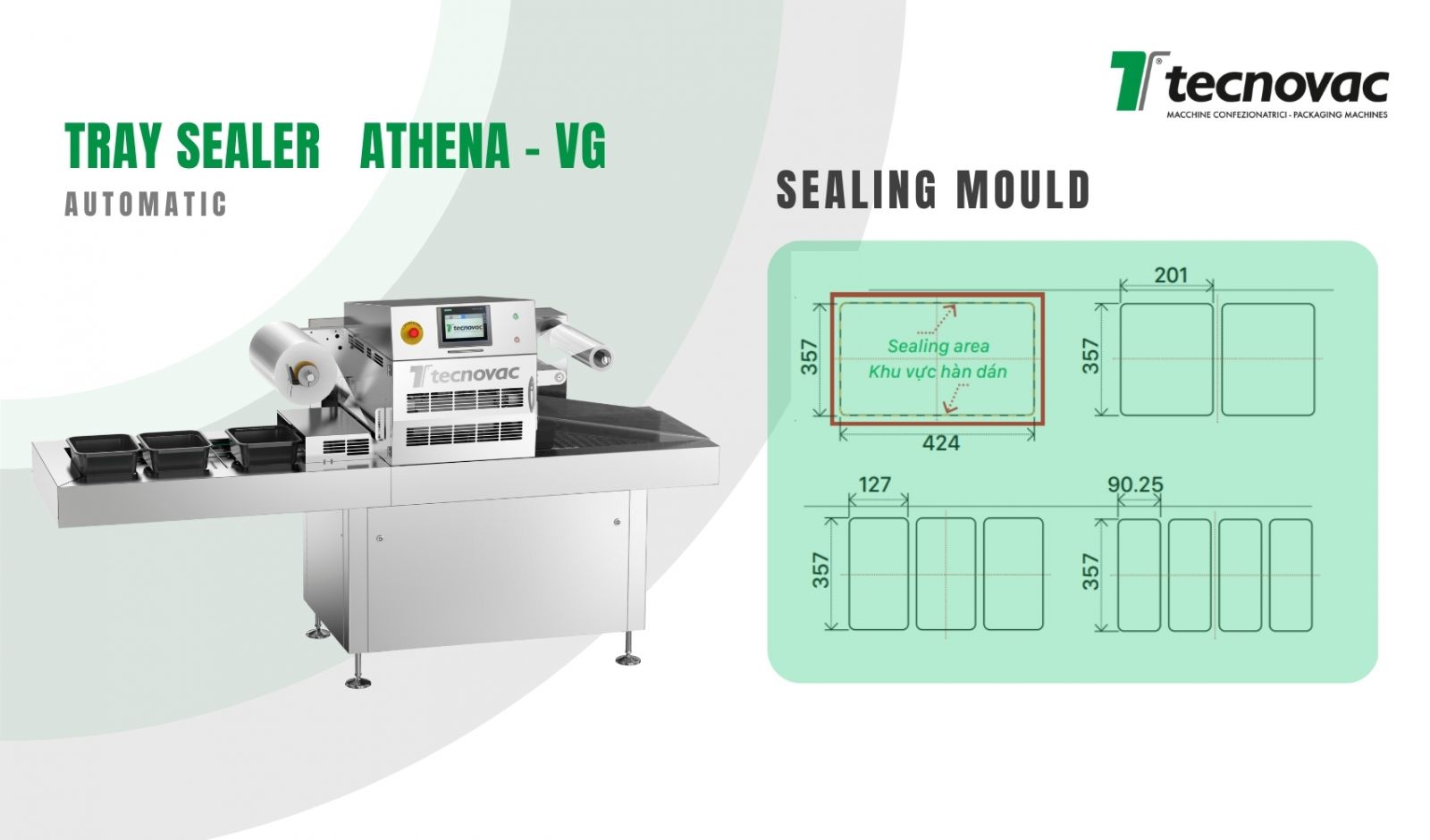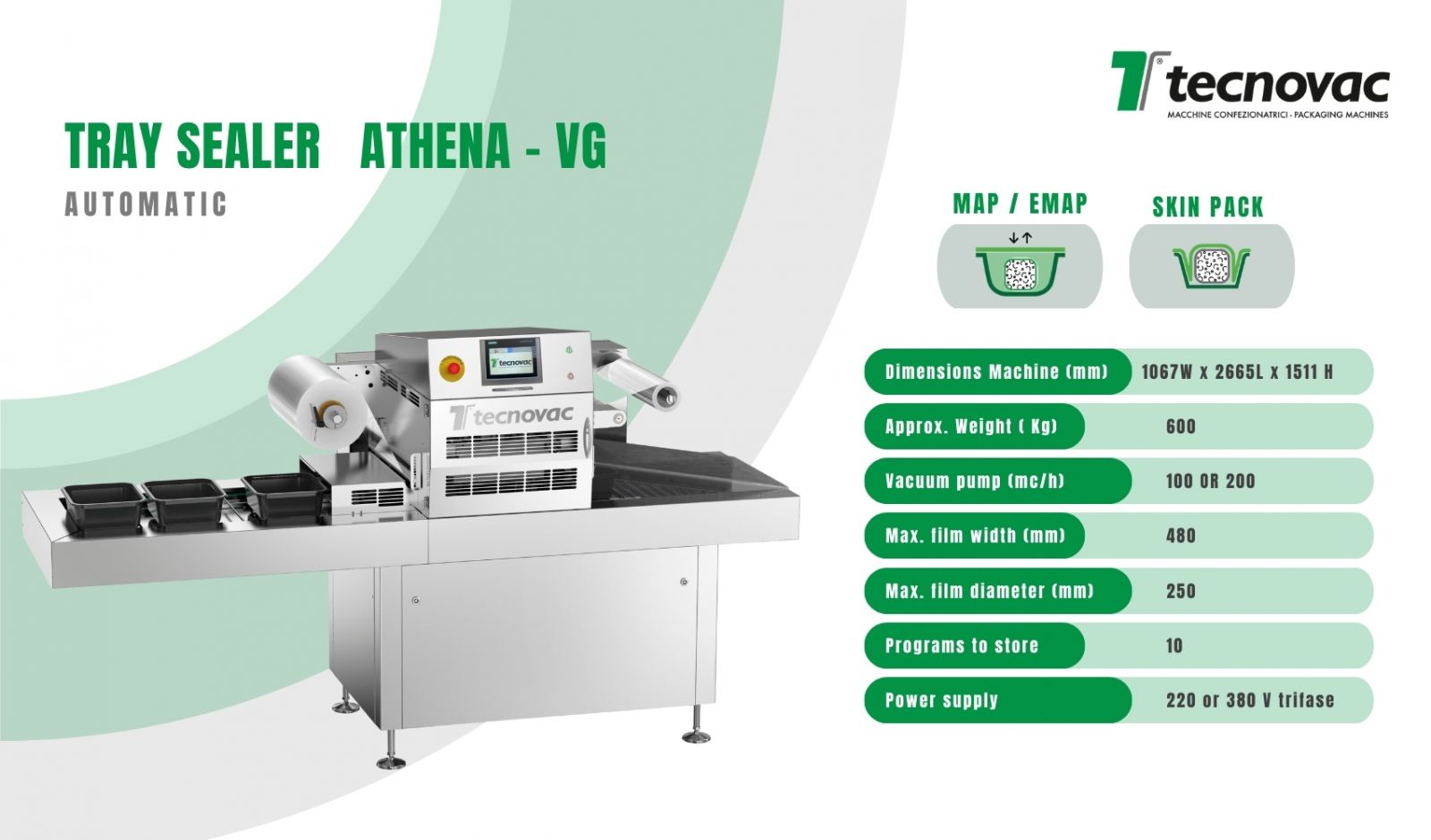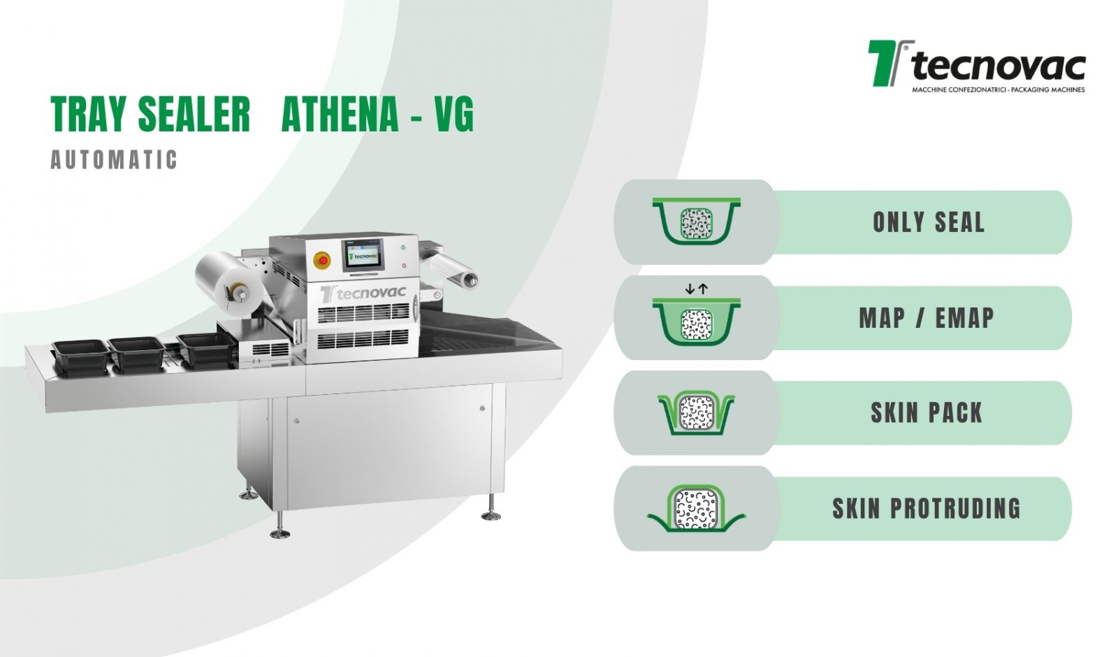 Thiết bị đóng gói khay tự động Athena - VG là một loại máy hoàn toàn tự động, mạnh mẽ và đáng tin cậy, được chế tạo hoàn toàn bằng thép không gỉ. Sử dụng cho đóng gói bao bì thực phẩm theo công nghệ ép chân không - Skin Pack