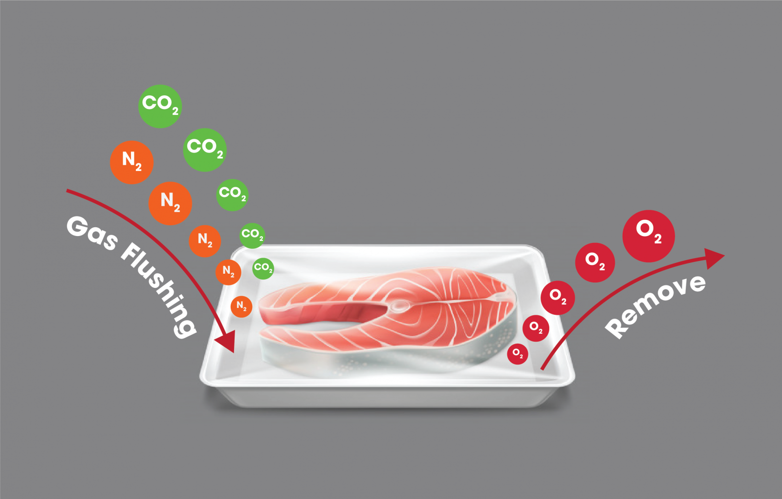 Khi điều chỉnh bầu không khí bên trong bao bì, lượng khí Oxy thường có thể giảm xuống 3% hoặc ít hơn. Khí trơ được sử dụng cho MAP thường đậm đặc hơn khí Oxy. Như vậy, khí Oxy bên trong bao gói thực phẩm bị đẩy ra khỏi bao gói. Điều này giúp kéo dài thời hạn sử dụng của sản phẩm, tính toàn vẹn của sản phẩm, bảo vệ chống đổi màu và đối với các sản phẩm như khoai tây chiên.