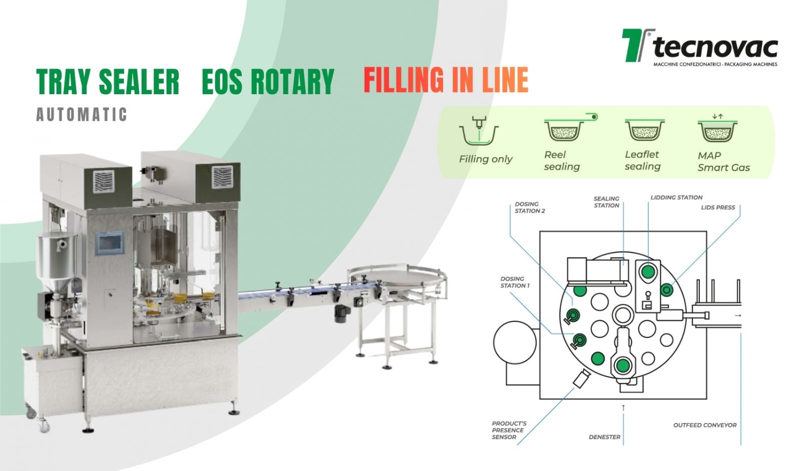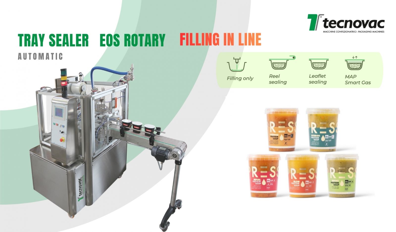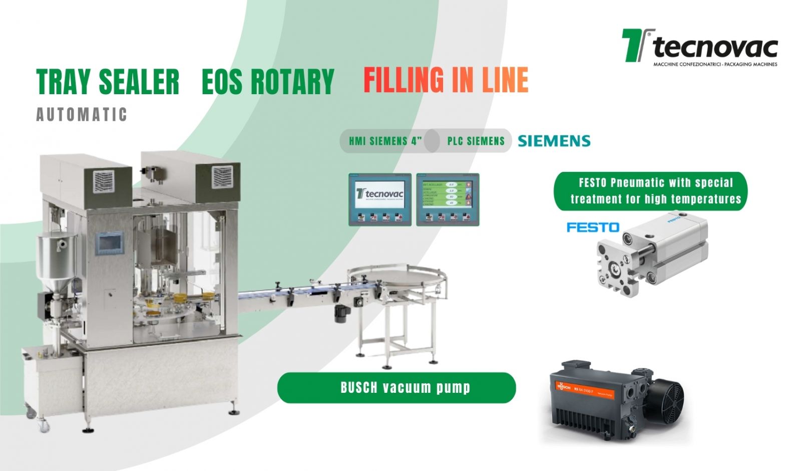 Máy đóng gói tự động EOS hoàn toàn có thể tùy chỉnh, được phát triển để định lượng kem, sữa chua, kem lạnh, súp, nước sốt và các sản phẩm đặc sệt bên trong các bao bì như cốc, xô hoặc khay trước khi được hàn dán màng nhựa hoặc đóng nắp; tất cả đều hoàn toàn tự động.