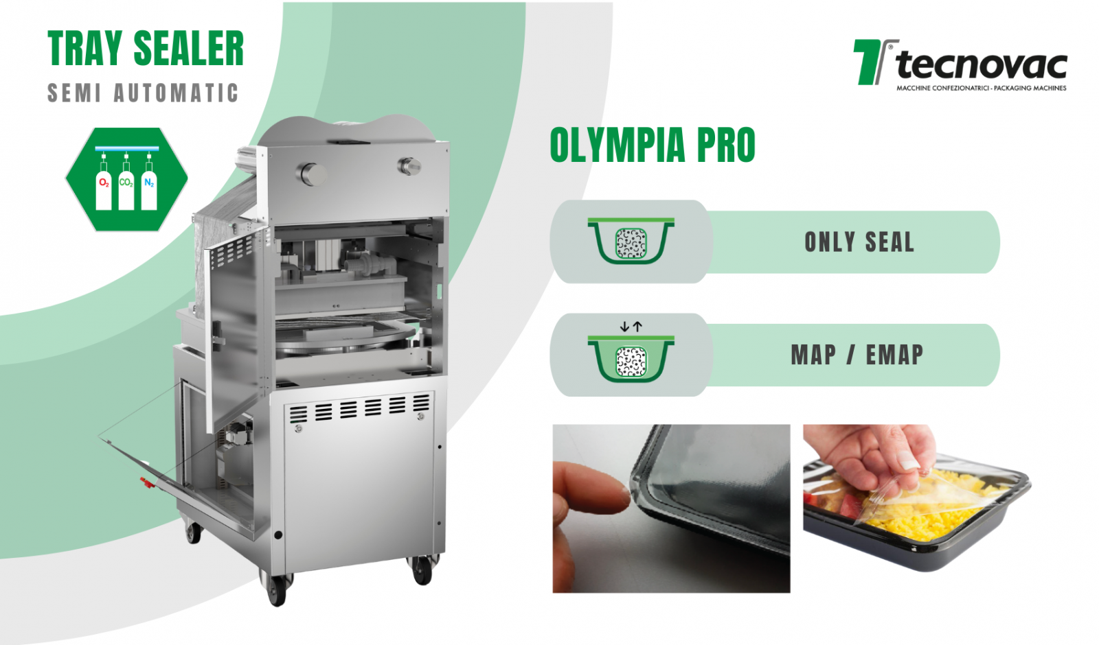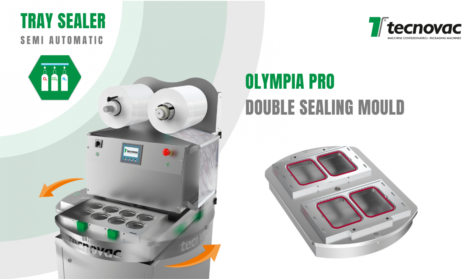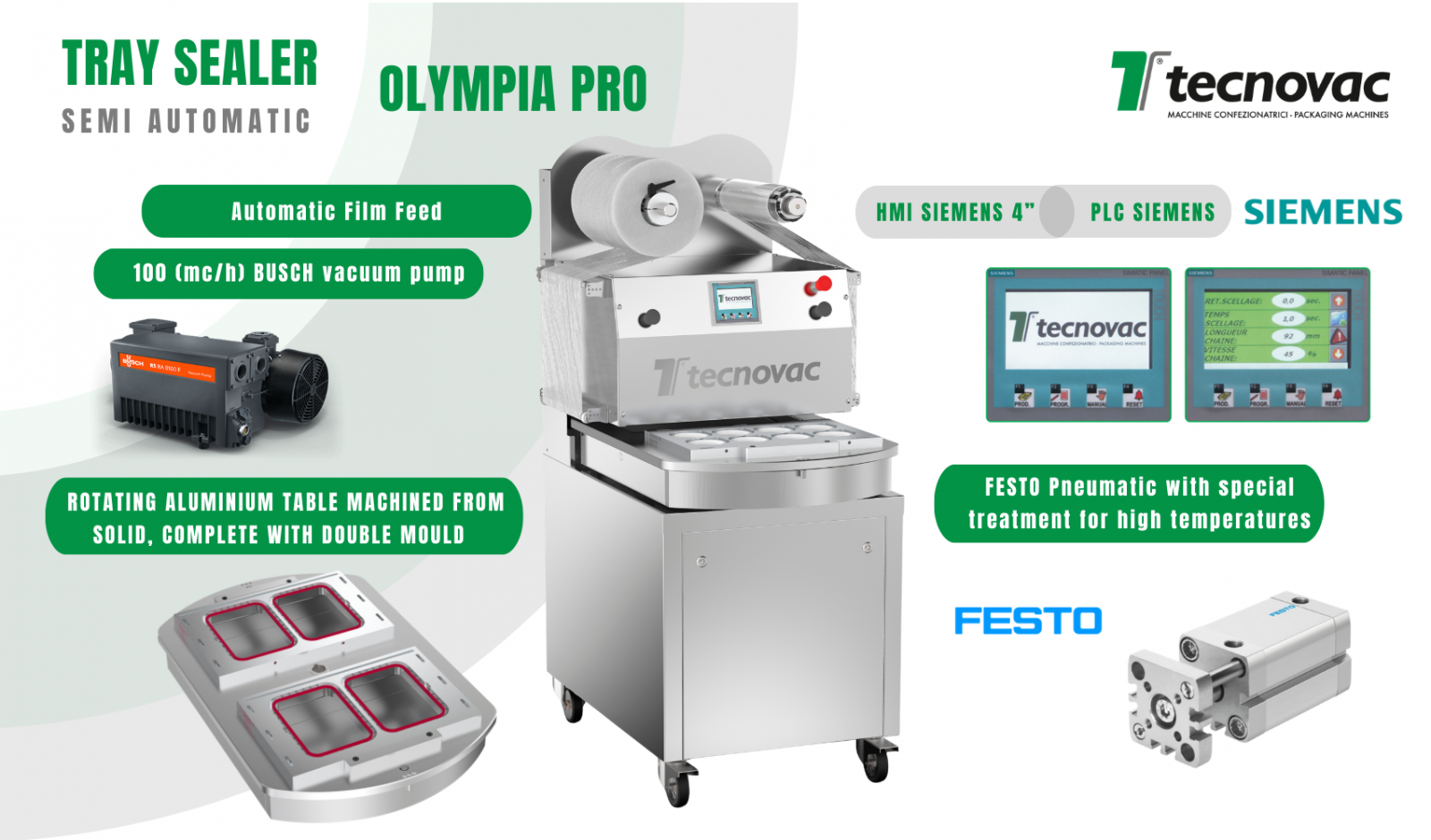 Thiết bị Olympia PRO đã được phát triển để dễ dàng đóng gói thực phẩm trong các khay định hình sẵn. Cấu hình bán tự động với bàn quay và hai buồng chân không, tối đa hóa quá trình sản xuất. Trong một chu kỳ đóng gói, có thể tăng năng suất với thiết kế tận dụng thao tác thu hồi khay đã đóng gói từ bộ khuôn thứ nhất và lắp khay chưa đóng gói lên bộ khuôn thứ hai. Tất cả là nhờ một cỗ máy cực kỳ đáng tin cậy và dễ vận hành.