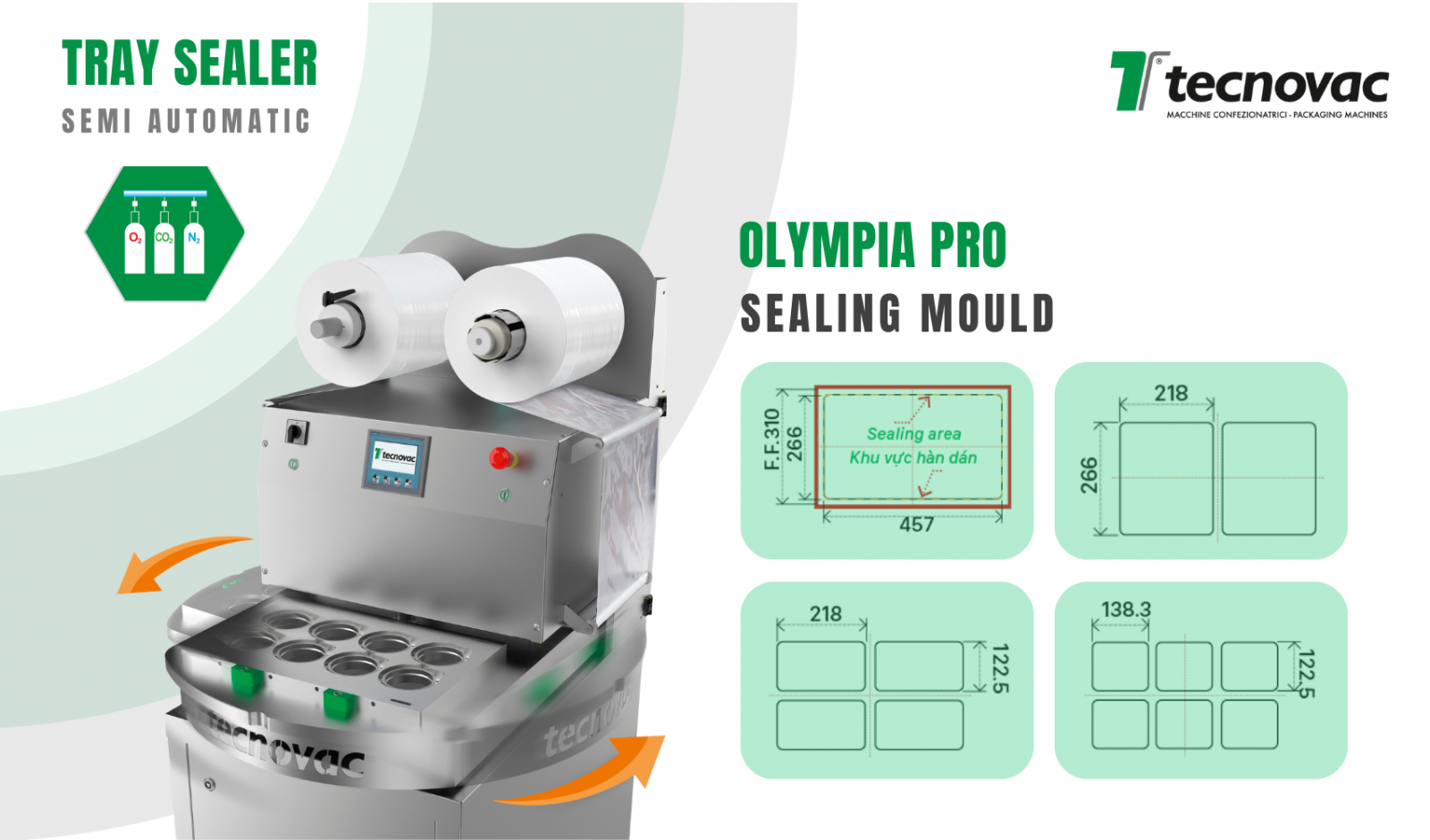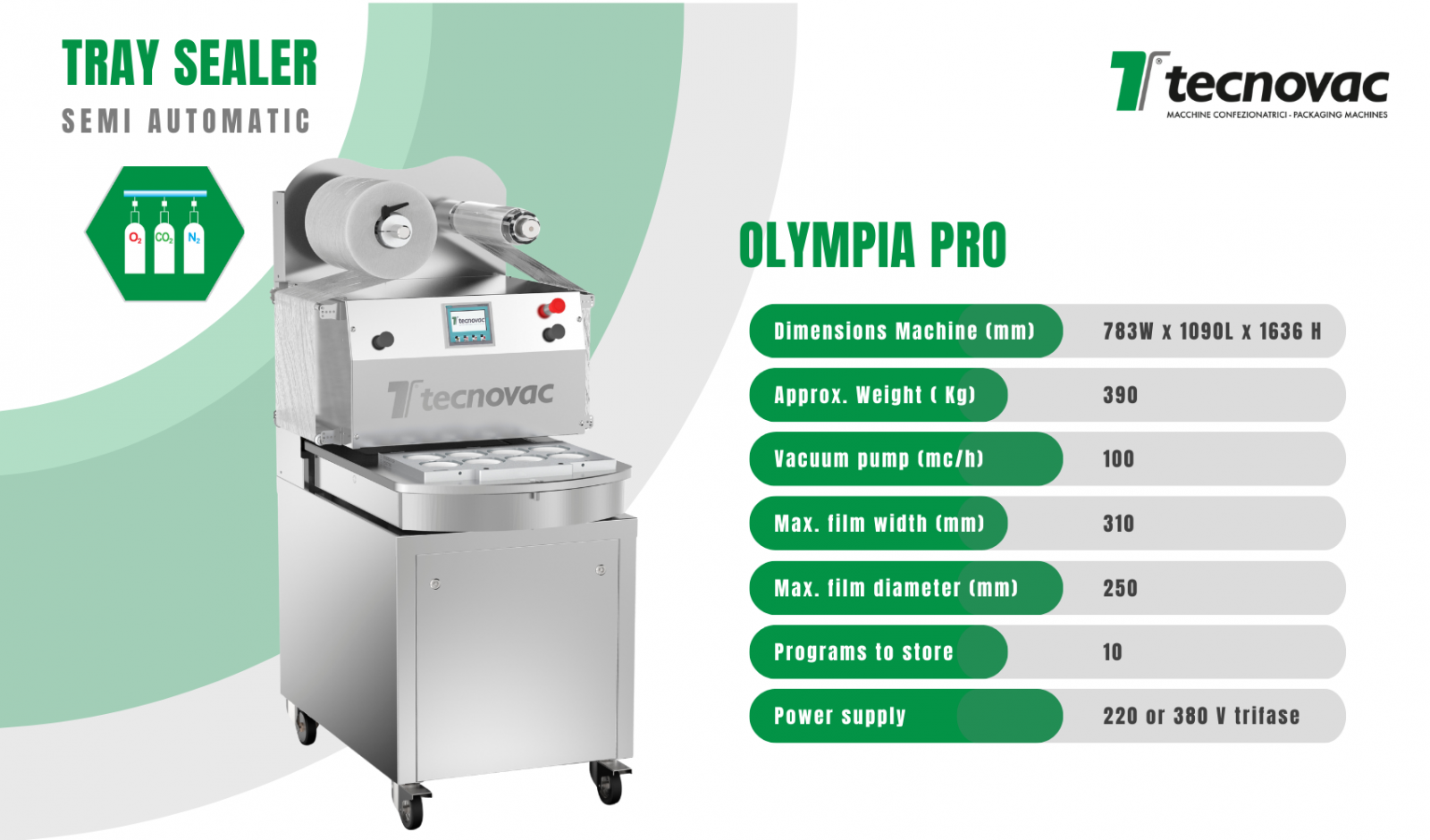 Thiết bị Olympia PRO, với cấu hình bán tự động, bàn xoay và hai buồng chân không, giúp tối đa hóa quá trình sản xuất; Trên thực tế, trong chu kỳ đóng gói, có thể dỡ hàng và chất hàng lên buồng chân không thứ hai, giúp tăng năng suất; Tất cả là nhờ một cỗ máy rất nhỏ gọn và mạnh mẽ. Diện tích khu vực hàn dán tối đa là 267 mm x 457 mm. Độ sâu tối đa là 100/140/250 mm. Số lượng vị trí đặt khay phụ thuộc vào kích thước khay.